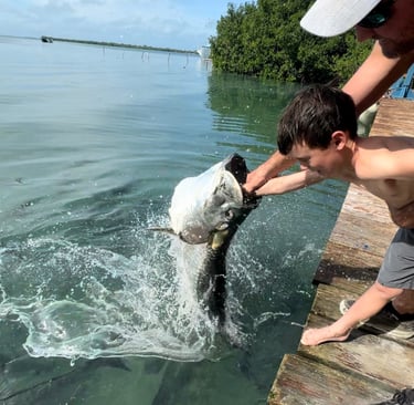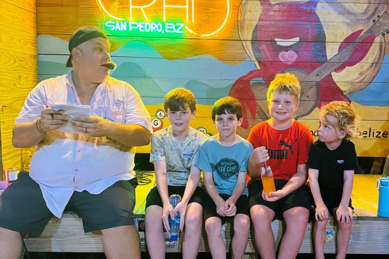 The next day, we hired a captain for a full day on the water. We started by fishing before making our way to Caye Caulker, a laid-back island where we enjoyed lunch and had the chance to feed tarpon—a must-do experience if you don’t mind some very large fish snapping close to your hands. From there, we continued on to snorkel at Hol Chan Marine Reserve and Shark Ray Alley, which ended up being a highlight of the trip and a huge hit with the boys.
